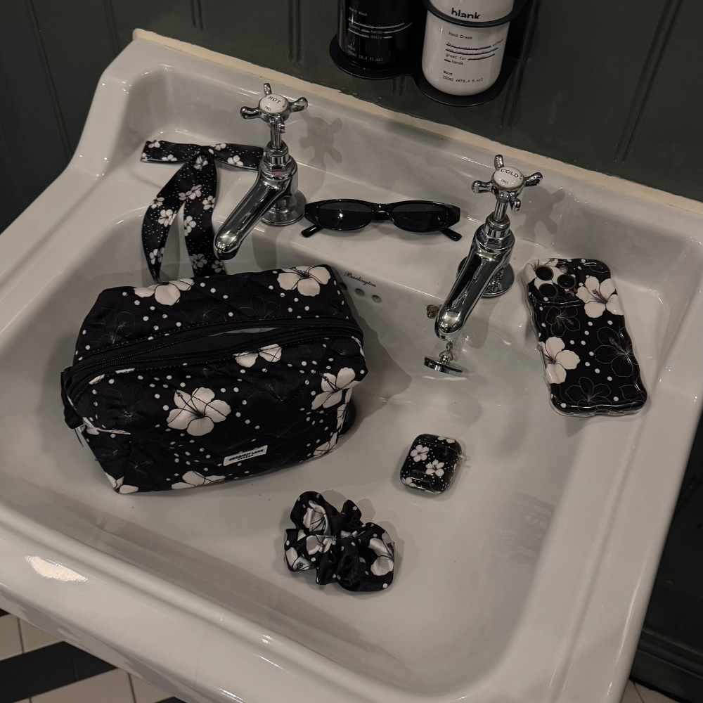 Our Satin Quilted Makeup Bag – Mono Flora is as pretty as it is practical, dressed in a dreamy monochrome floral print that feels oh-so-chic. The silky satin quilting gives it a touch of luxury, while the spacious interior is perfect for stashing all your must-haves – from lippies and liners to your favourite perfume mini.