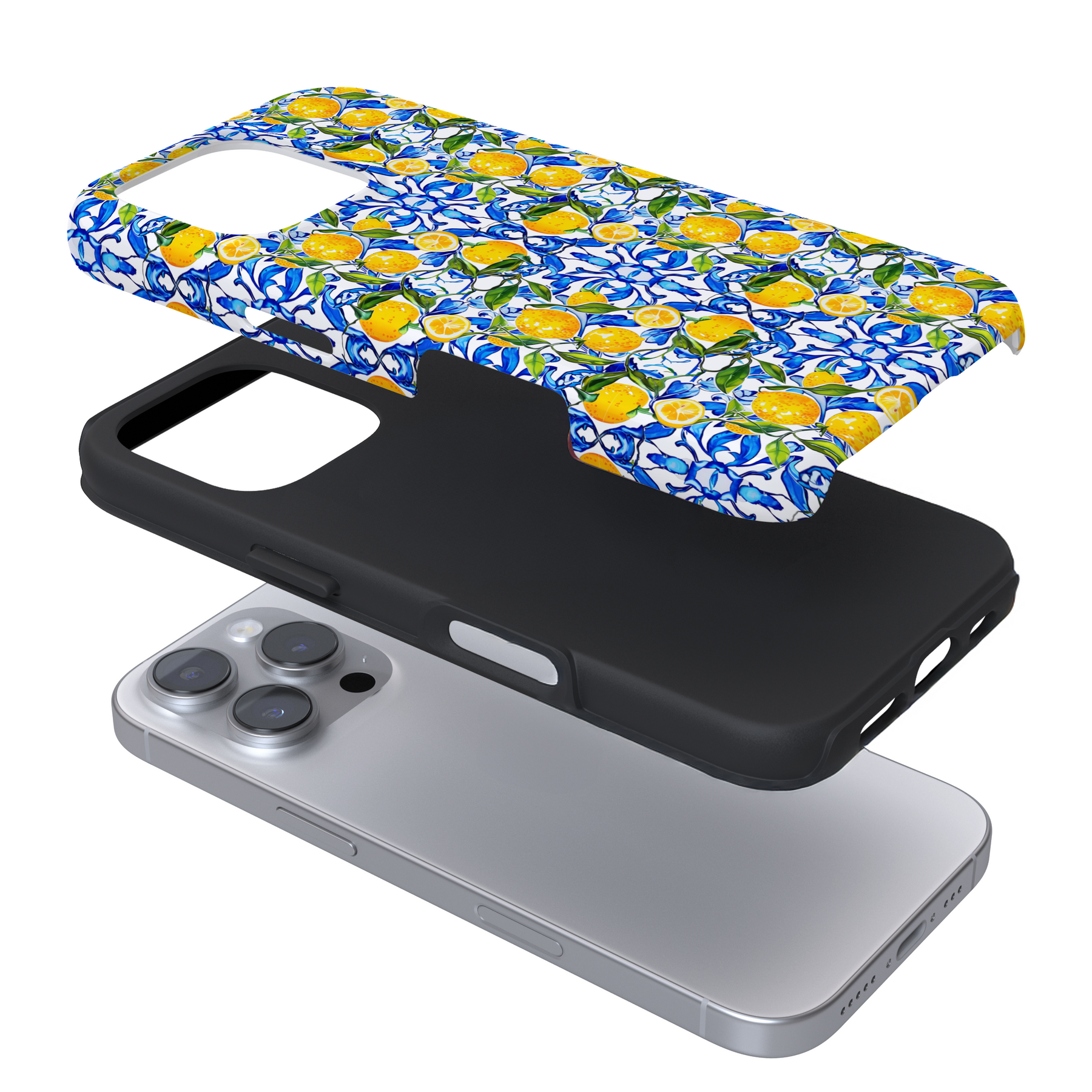 A hand holding a smartphone encased in Coconut Lane's Tough Phone Case - Amalfi Lemon. This design showcases vibrant, intricate patterns of lemons, leaves, and blue florals against a white background. It provides durable protection while ensuring the phone's camera lenses remain safely visible at the top left corner of the case.