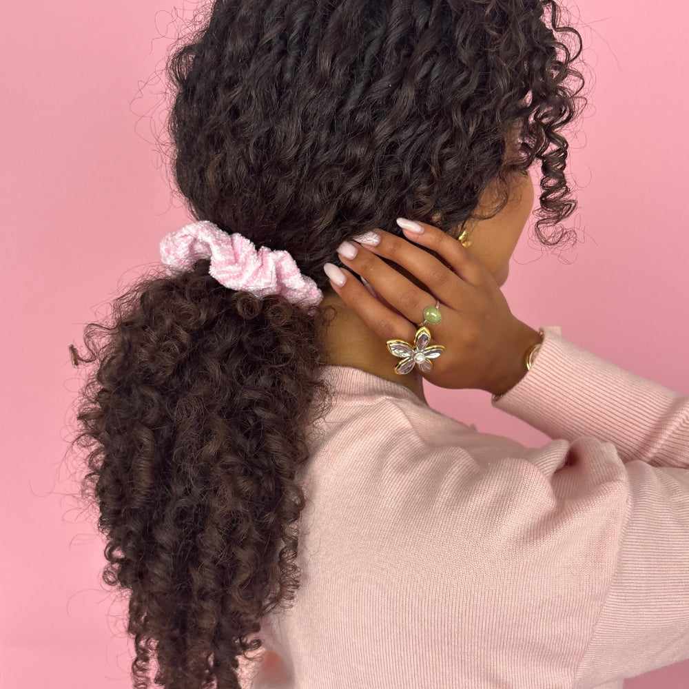 Your new hair hero, but make it fluffy. The Powder Stripes Towel Scrunchie is made from soft, absorbent towel-textured fabric in the dreamiest powder-pink and cream stripes. Perfect for post-shower hair, beach days, or adding a cosy pop to your everyday ponytail or bun, it’s gentle on strands and oh-so-comfortable to wear.