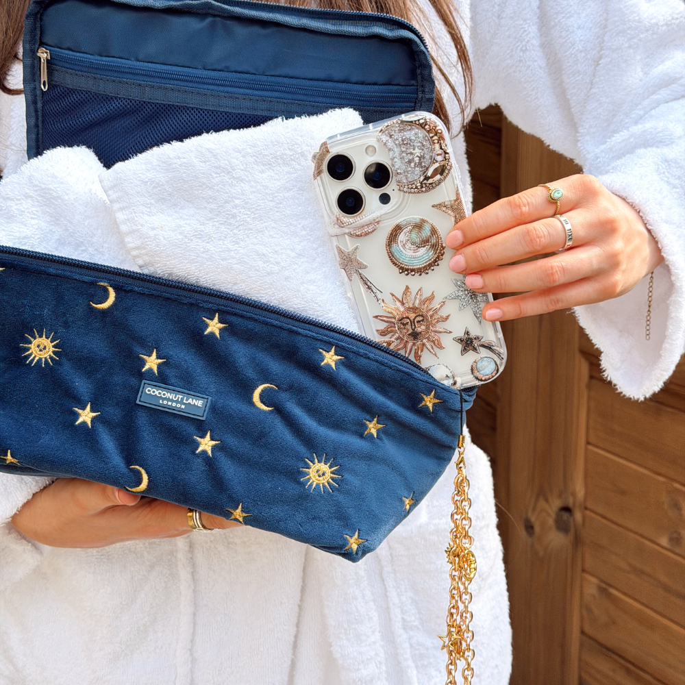 Girl holding pastel celestial phone case next to vanity case wearing white dressing gown in sauna